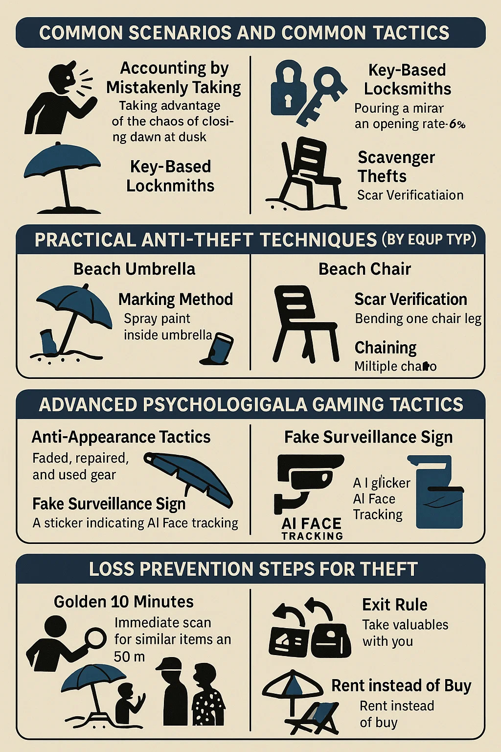 Oo, ang pagnanakaw ng Mga payong beach At ang mga upuan ay isang pangkaraniwang problema sa beachfront. Nasa ibaba ang isang tiered na diskarte sa pagtugon batay sa karanasan ng mga tagapamahala ng beach at regular na mga bisita: