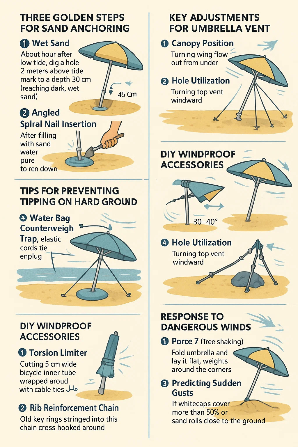 Sand Burial at Hammering: Matapos punan ang buhangin, ibuhos ang tubig at i-tamp ito upang makabuo ng isang patong na tulad ng semento. Matapos ipasok ang payong, pindutin ang base sa loob ng 10 segundo upang mag -aplay ng presyon.
