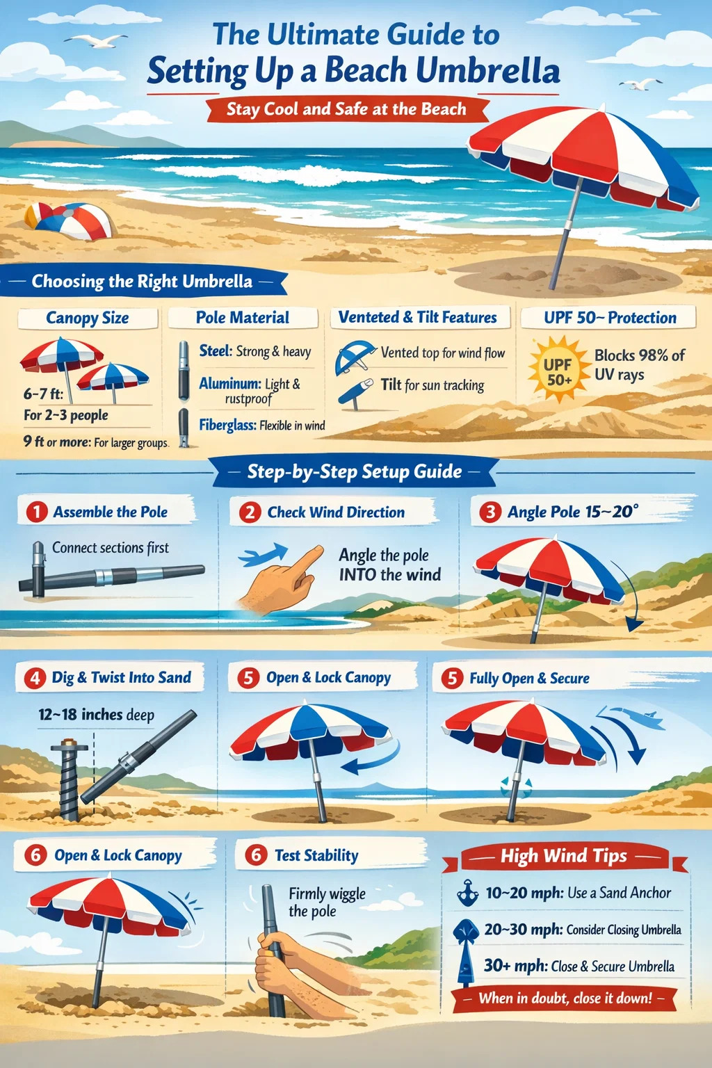 Sinasaklaw ng gabay na ito ang bawat hakbang nang detalyado — mula sa pagpili ng tamang payong sa tabing-dagat hanggang sa pagpapanatiling matatag sa pagbugsong mahigit 20 mph — para mas kaunting oras ang iyong ginugugol sa pakikipagbuno sa mga kagamitan at mas maraming oras sa pag-enjoy sa tubig.