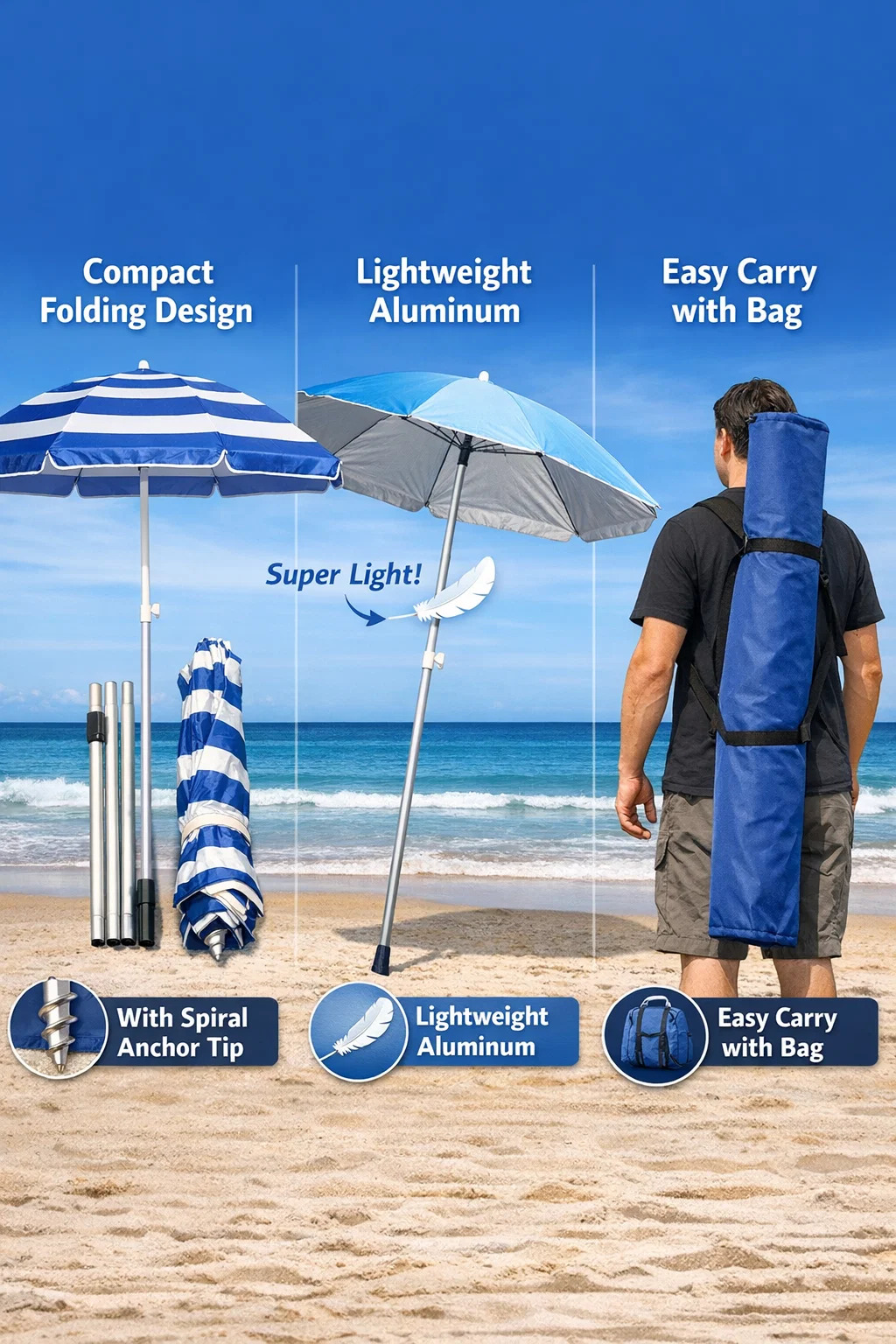 Mga Bentahe: Ang ganitong uri ng payong sa tabing-dagat ay hindi lamang lumalaban sa kalawang ngunit napakagaan din, na nagpapahintulot sa iyo na dalhin ito gamit ang isang kamay. Ito ay napaka-maginhawa para sa mga kailangang magdala ng kagamitan mula sa paradahan hanggang sa dalampasigan.
