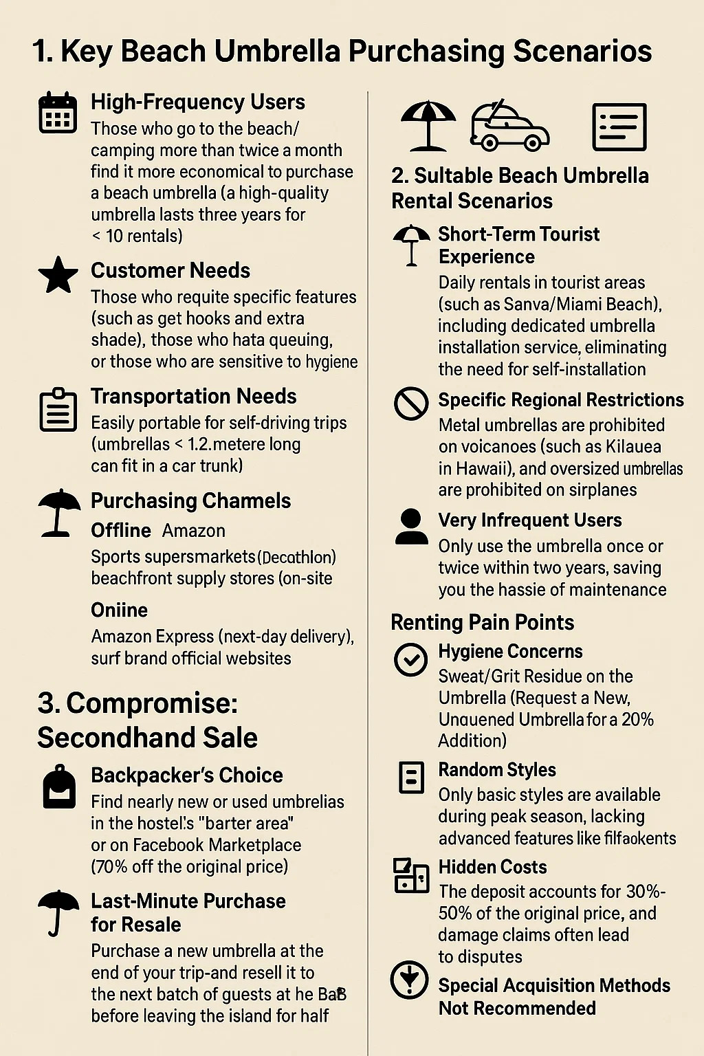 Pagkuha a Beach Umbrella Nangangailangan ng kakayahang umangkop batay sa dalas ng paggamit, likas na paglalakbay, at badyet. Ang sumusunod ay isang pagsusuri ng empirikal: