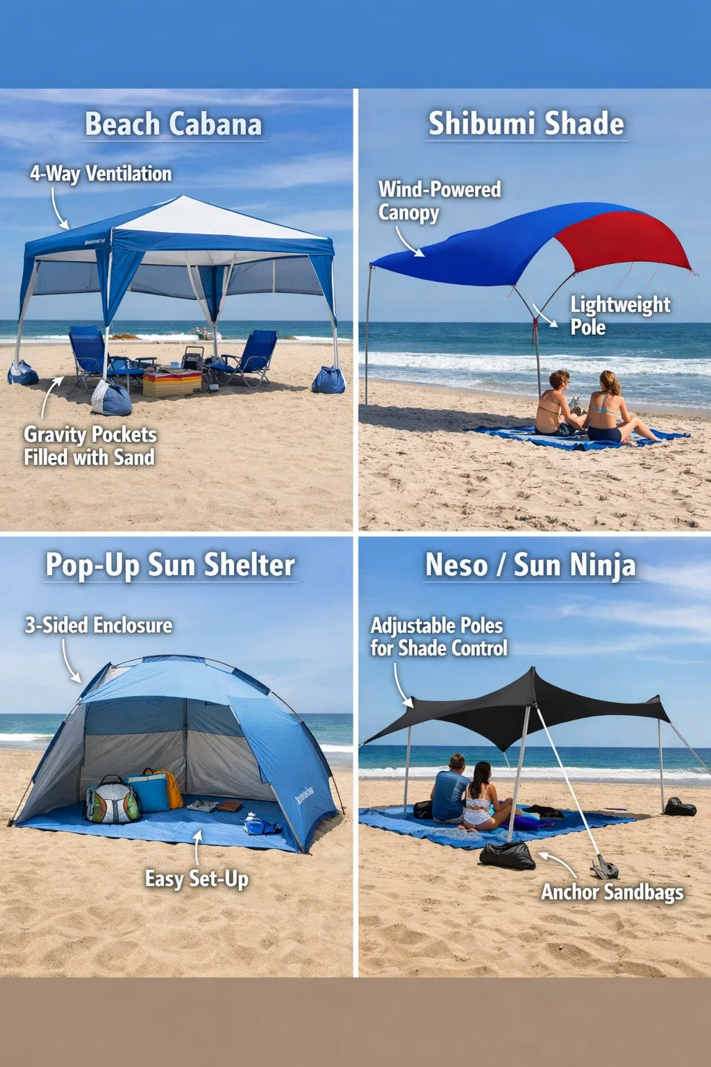 Habang mga payong sa dalampasigan ay klasiko, kung naghahanap ka ng mas matatag, maluwag, o modernong karanasan sa pagprotekta sa araw, ang mga sumusunod na opsyon ay nag-aalok ng mahusay na proteksyon sa maraming paraan: