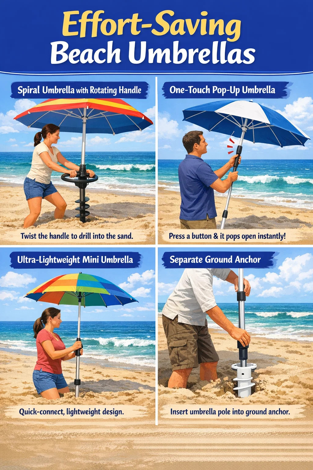 Paano ito gumagana: Sa halip na gumamit ng malupit na puwersa upang itulak ito pababa, paikutin mo ang hawakan nang pabalik-balik gamit ang dalawang kamay, tulad ng paghawak sa mga manibela ng bisikleta, at ang spiral drill bit sa ilalim ng payong ay madaling napuputol sa buhangin.