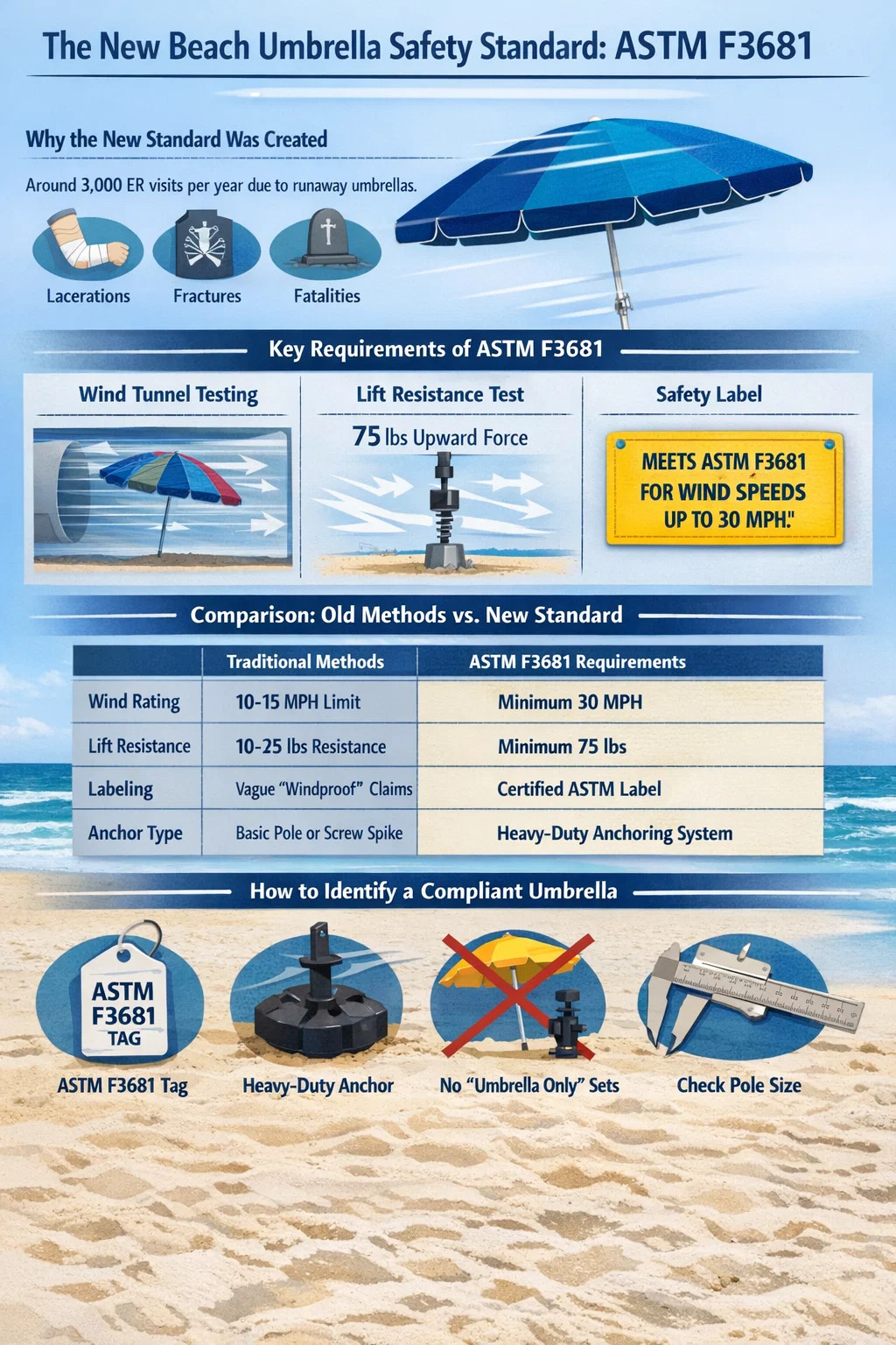 Ang bagong payong sa dalampasigan standard ay ASTM F3681-24 (na-update sa F3681-25) , na nagtatatag ng unang opisyal na mga kinakailangan sa pagganap para sa paglaban ng hangin at kaligtasan sa pag-angkla. Sa ilalim ng bagong alituntuning ito, isang pamantayan payong sa dalampasigan na may diameter na 7.5 talampakan ay dapat na makatiis bilis ng hangin na hanggang 30 milya bawat oras (MPH) nang hindi nagiging airborne. Bilang karagdagan, ang sistema ng anchoring ay dapat magbigay ng hindi bababa sa 75 pounds ng pagtutol laban sa pataas na puwersa ng pag-angat upang matiyak na mananatili itong matatag na nakatanim sa buhangin.