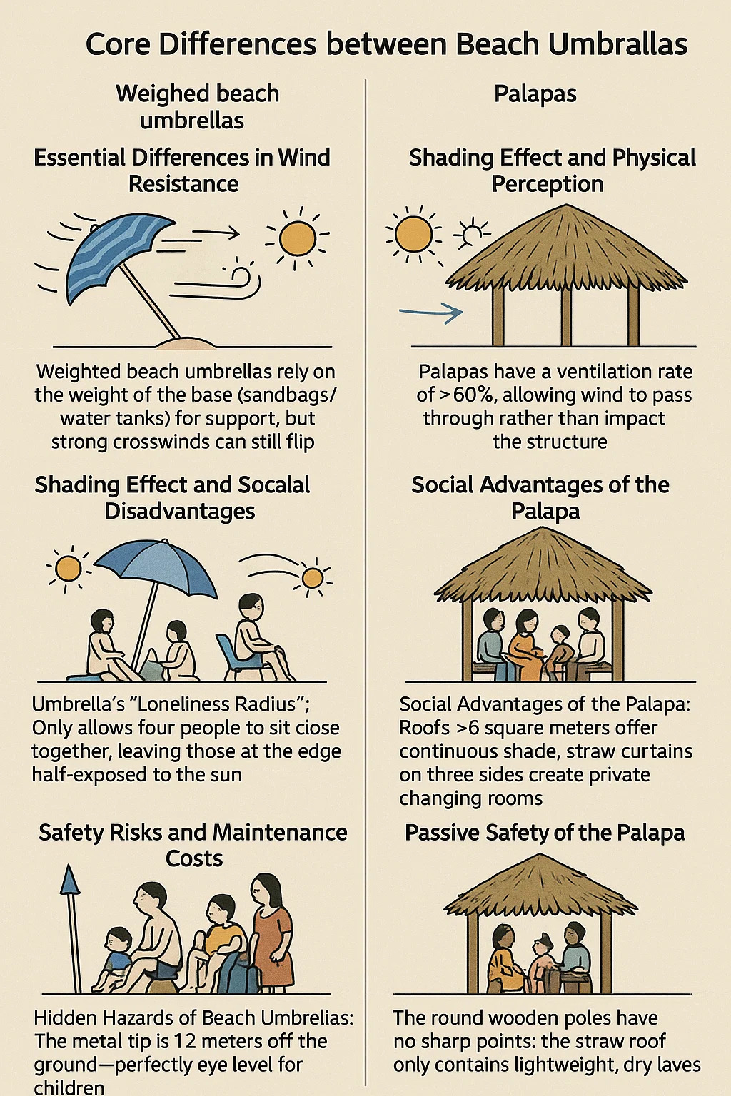 Mga bentahe sa lipunan ng palapa: bubong> 6 square meters ay nag -aalok ng patuloy na lilim, na akomodasyon ng tatlong henerasyon; Ang mga kurtina ng dayami sa tatlong panig ay lumikha ng mga pribadong pagbabago ng mga silid, na nagpapahintulot sa mga surfboard/backpacks na maayos na naayos sa pamamagitan ng pag -hang mula sa mga beam.